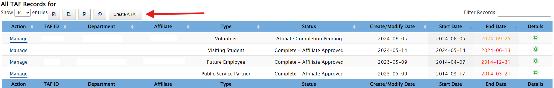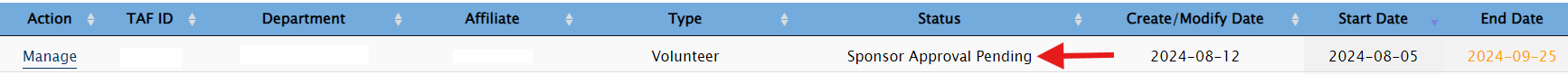 1. Final approval of the information entered by the affiliate. Click "Manage" next to the TAF you want to review..