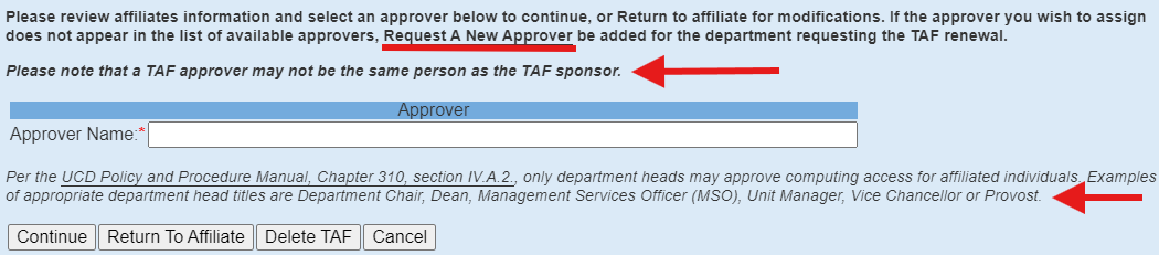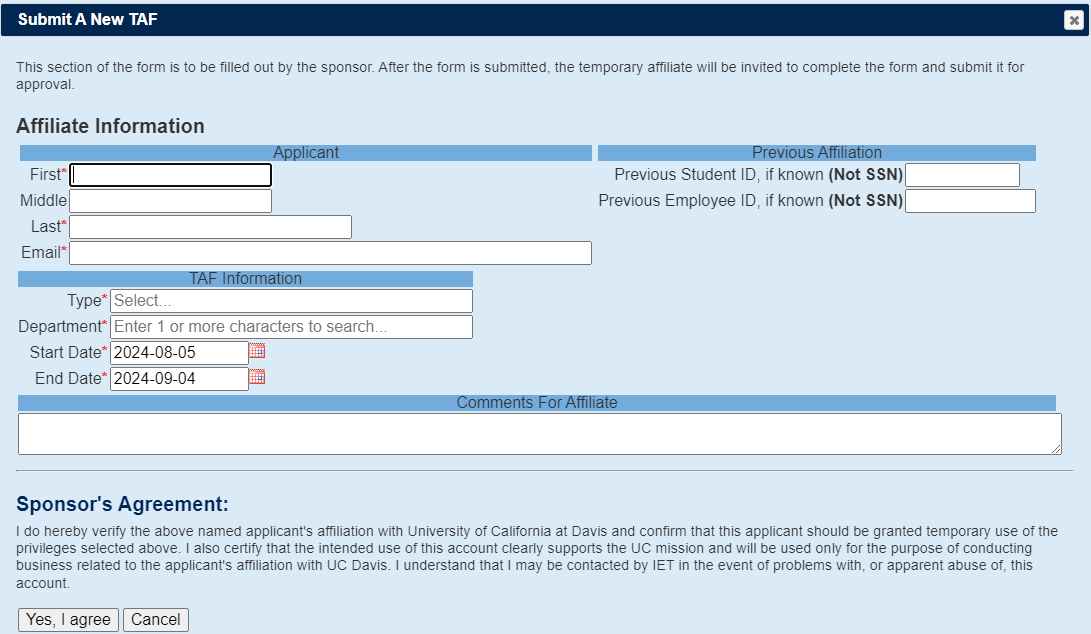 How to Set Up a Temporary UC Davis Affiliate for Access.  This page provides step-by-step instructions for the sponsor for filling out a TAF until finalization.