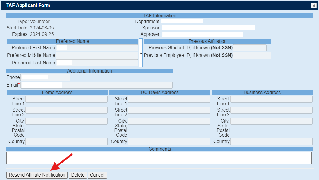 The sponsor will be receive and email Subject Line: UC Davis Temporary Affiliate Form Complete to verify that the form has been completed by the affiliate. Click the unique link provided in the email to proceed or log into the TAF portal to check on your TAFs. You can verify if the affiliate has or has not completed their part.