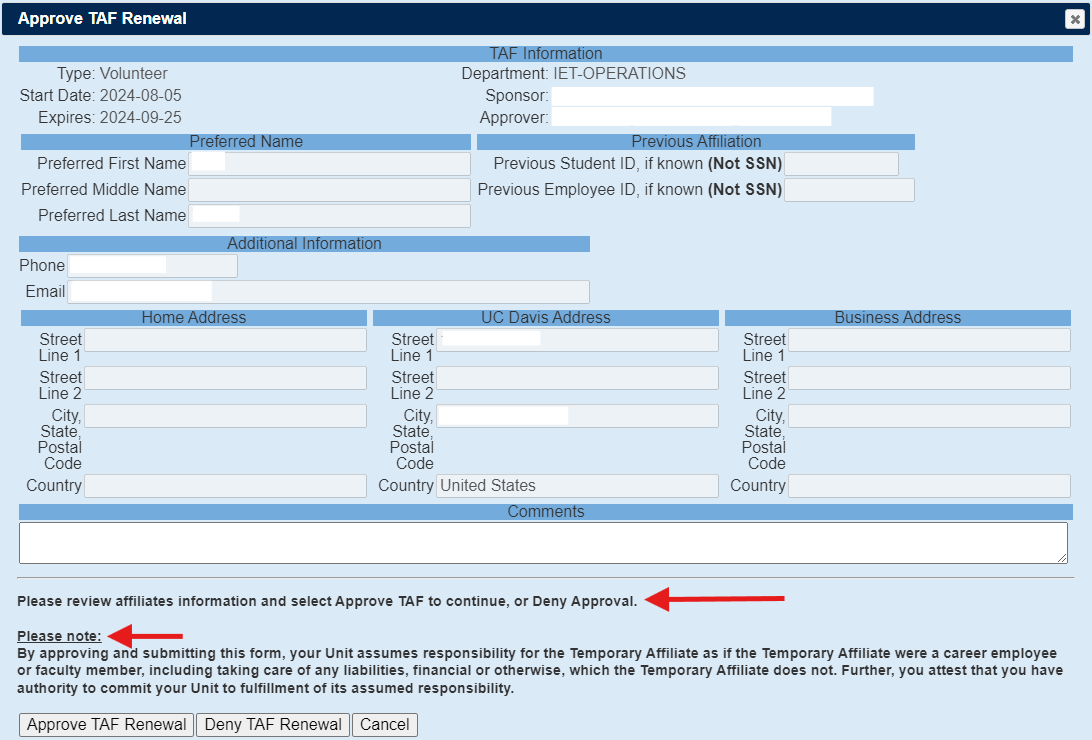 The TAF applicant will receive an email Subject: Your UC Davis Temporary Affiliate account REQUEST or RENEWAL APPROVED.